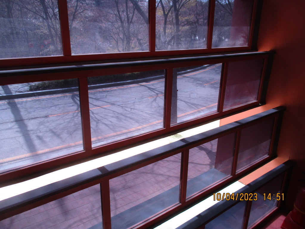 색유리를 통해서, 또 막히지 않은 곳을 통해서 바깥 풍경을 볼 수 있다.
