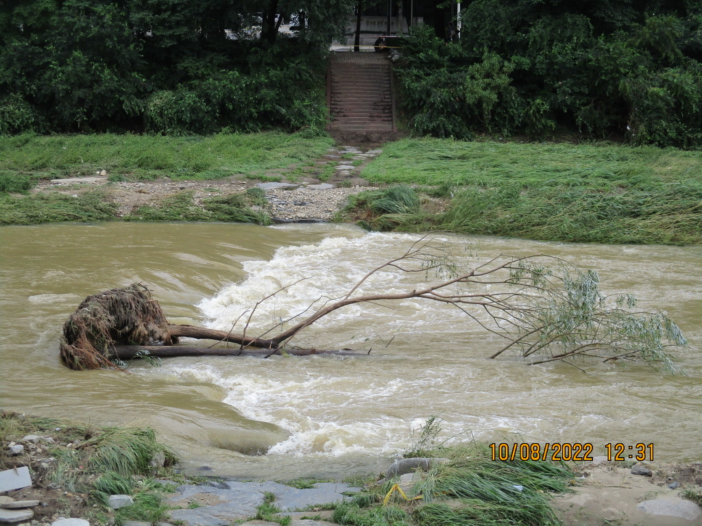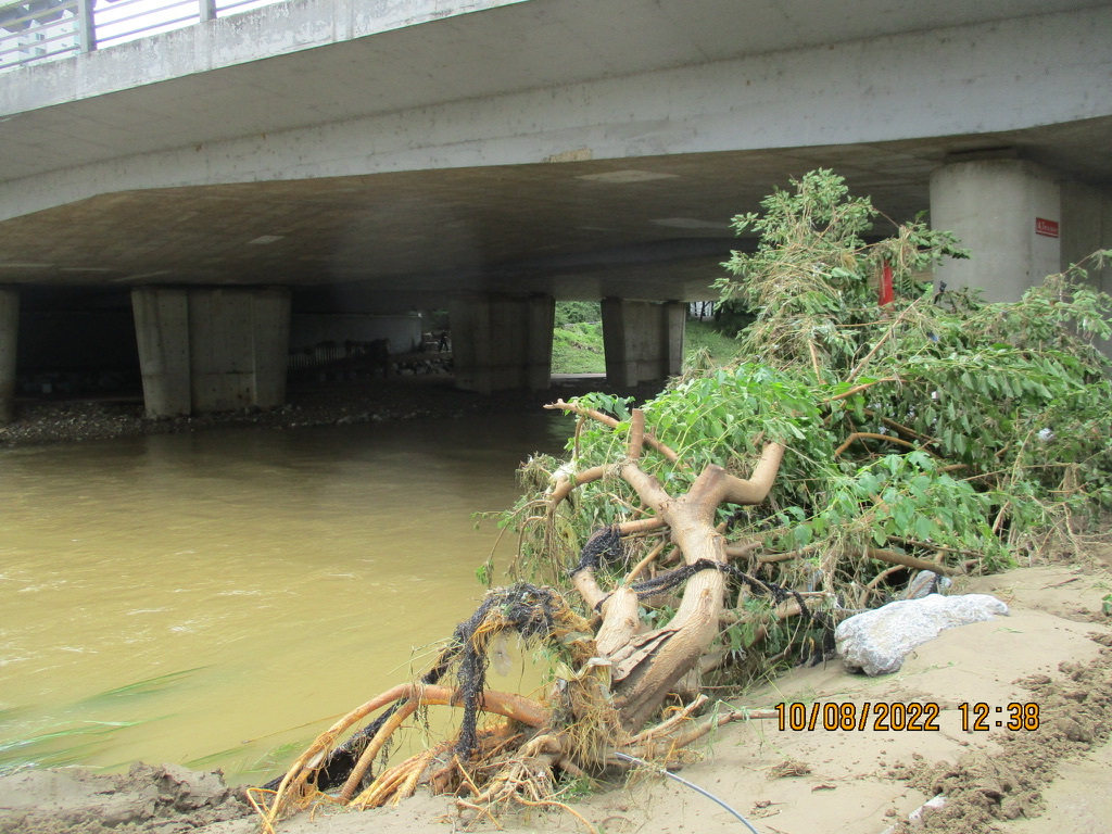 뿌리째 뽑힌 나무가 하천 가운데 누워있다.