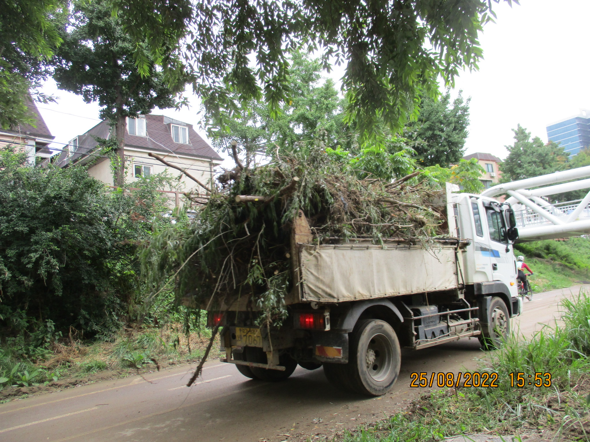 자전거길 곁 인도길로 산책을 하려는데 쓰러진 나무를 잘라 트럭에 싣고 있는 중이었다.